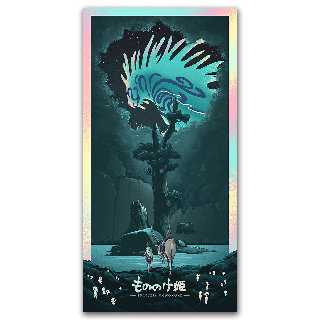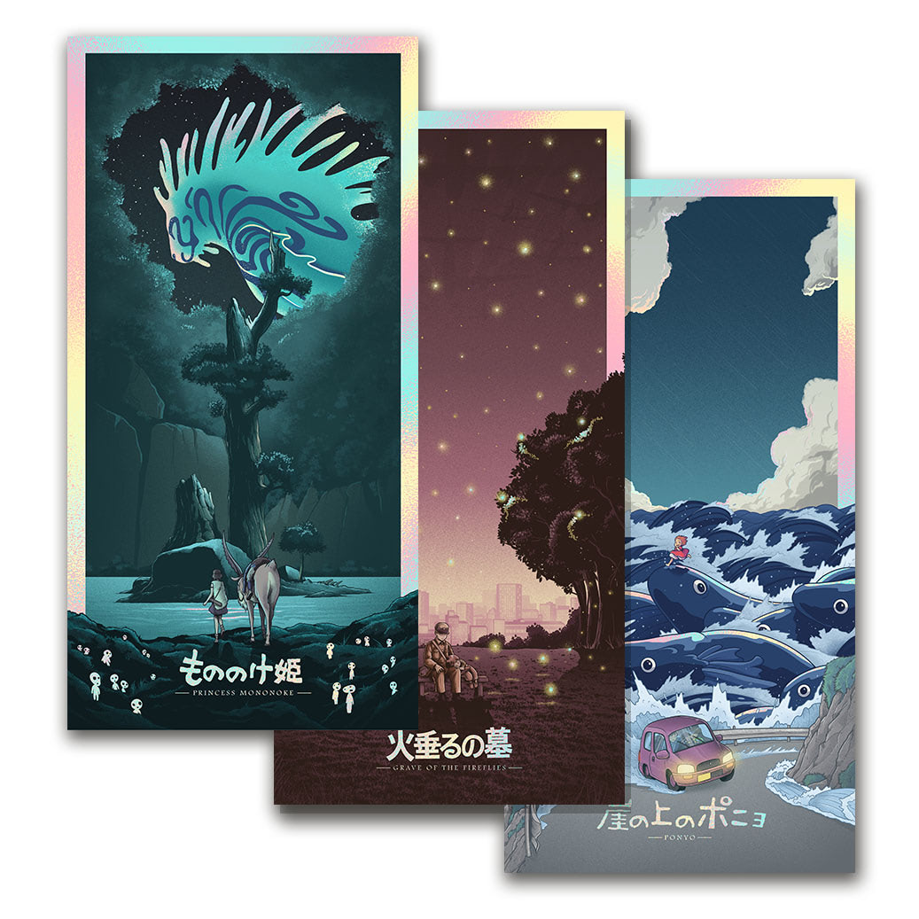 Three holographic prints that kick off our Ghibli collection with artist, Mark Bell. Available individually or as a set. EXCLUSIVE.