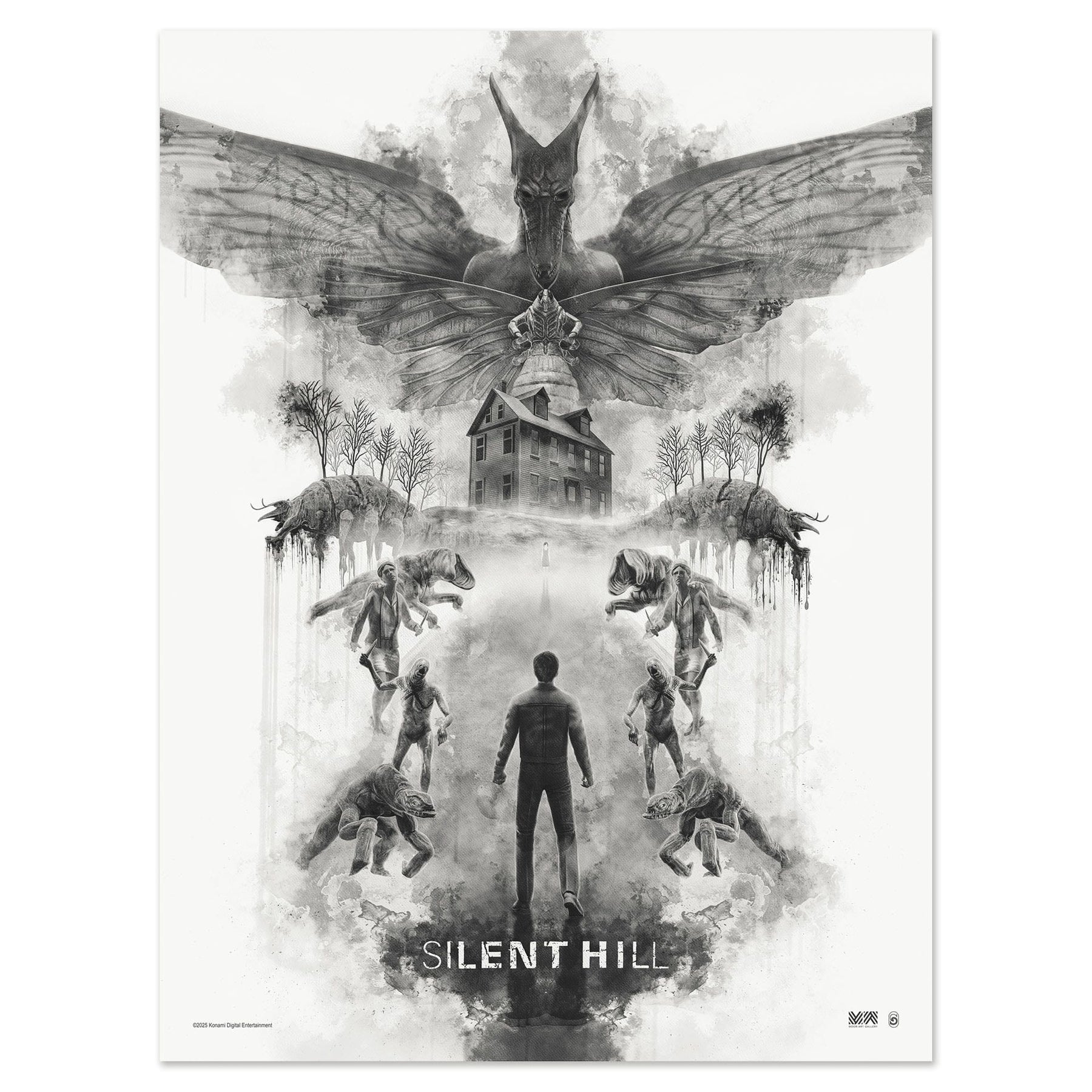 Moor-Art is proud to present the first in a collection of limited and numbered art prints based on the horror game masterpiece - SILENT HILL. First up, a darkly psychological take from artist Chris Skinner. Monsters of the streets and mind are represented as blots in a Rorschach test - the expanding ink on archival textured art paper resembling the all encompassing and iconic fog. Fresh from the announcement of a remake, this piece stands as a definitive representation of the first steps into Silent Hill.